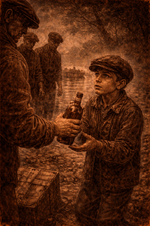 No one lingered. No one explained. The river carried the boats back into motion, fog folding around them as if it had learned how to make men disappear. In moments, there was nothing left but churned mud and the faint smell of grain and alcohol mixing into something older.