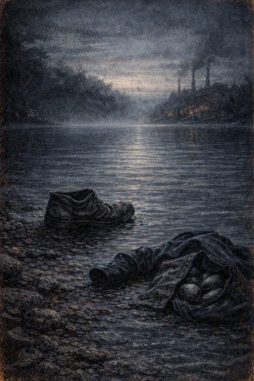 A pocket heavy with stones that were never meant to be carried, gathered in a hurry by someone who believed weight could argue with current.